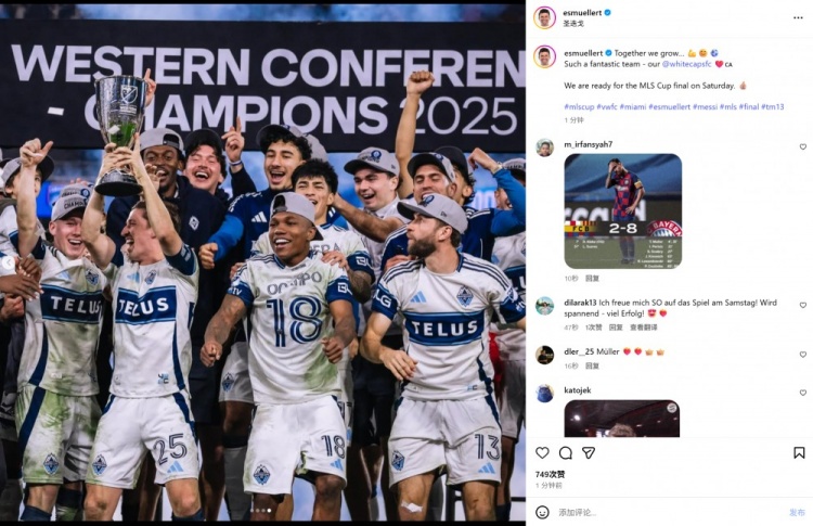 穆勒社媒晒出了与队友庆祝夺得分区冠军奖杯的合照,配文写道:“我们一起进步!温哥华白浪是如此棒的一支球队,我们已经为周六的总决赛做好了准备!”