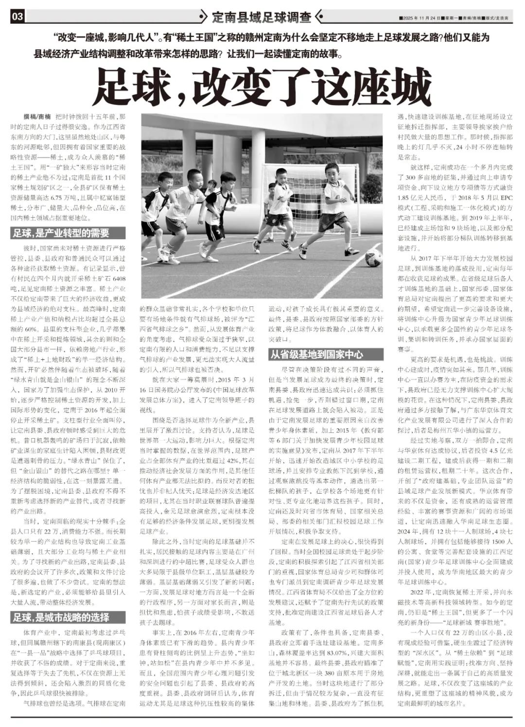一个人口仅有22万的山区小县,没有现成经验可借鉴,硬生生蹚过了经济转型的 “深水区”。从 “稀土依赖” 到 “足球赋能”,定南用实践证明:找准方向、坚持深耕,就能走出一条属于自己的高质量发展之路。足球,不仅改变了这座城的产业结构,更重塑了这座城的精神风貌,成为定南最鲜明的城市名片。